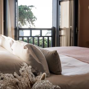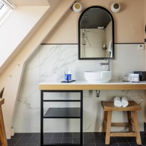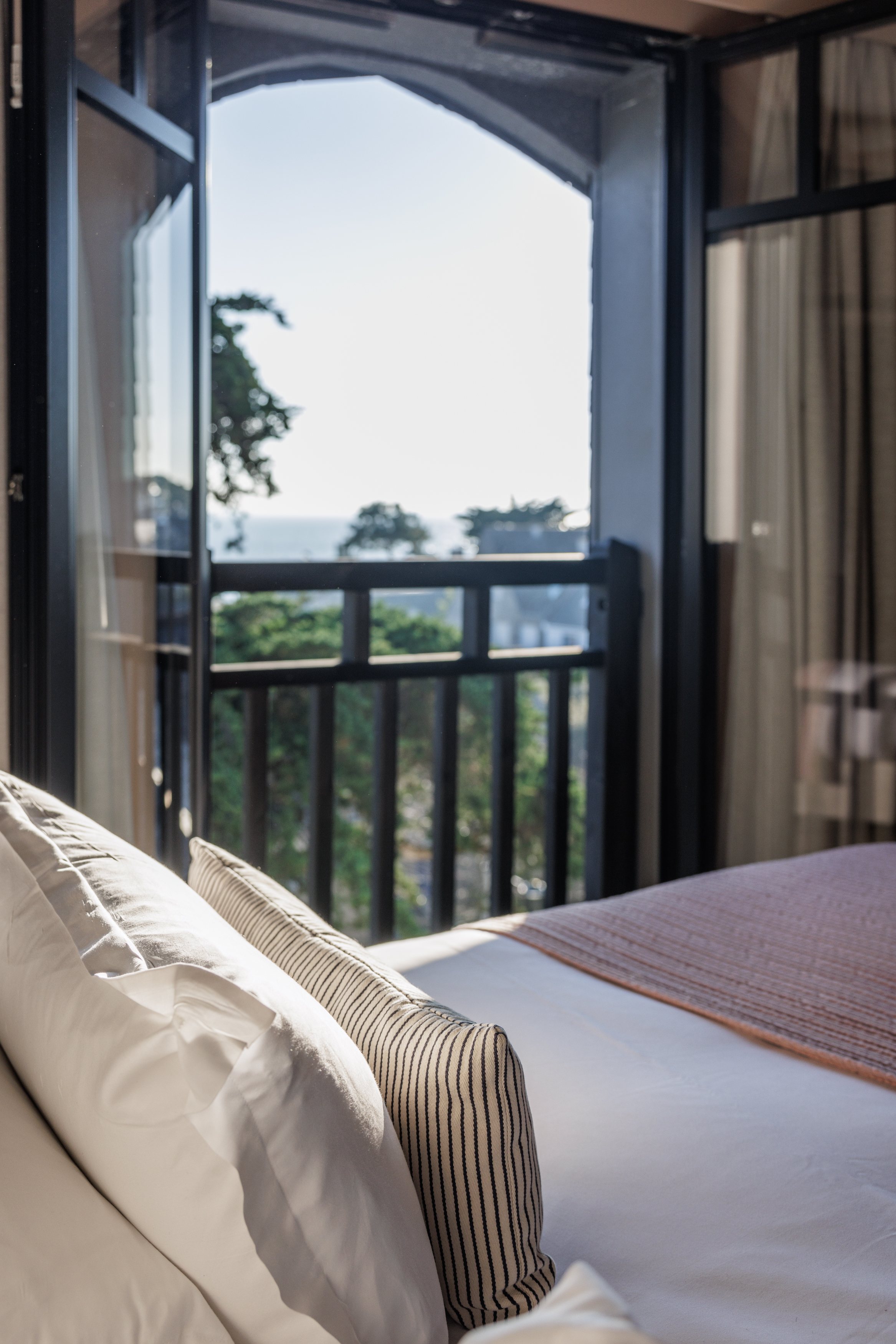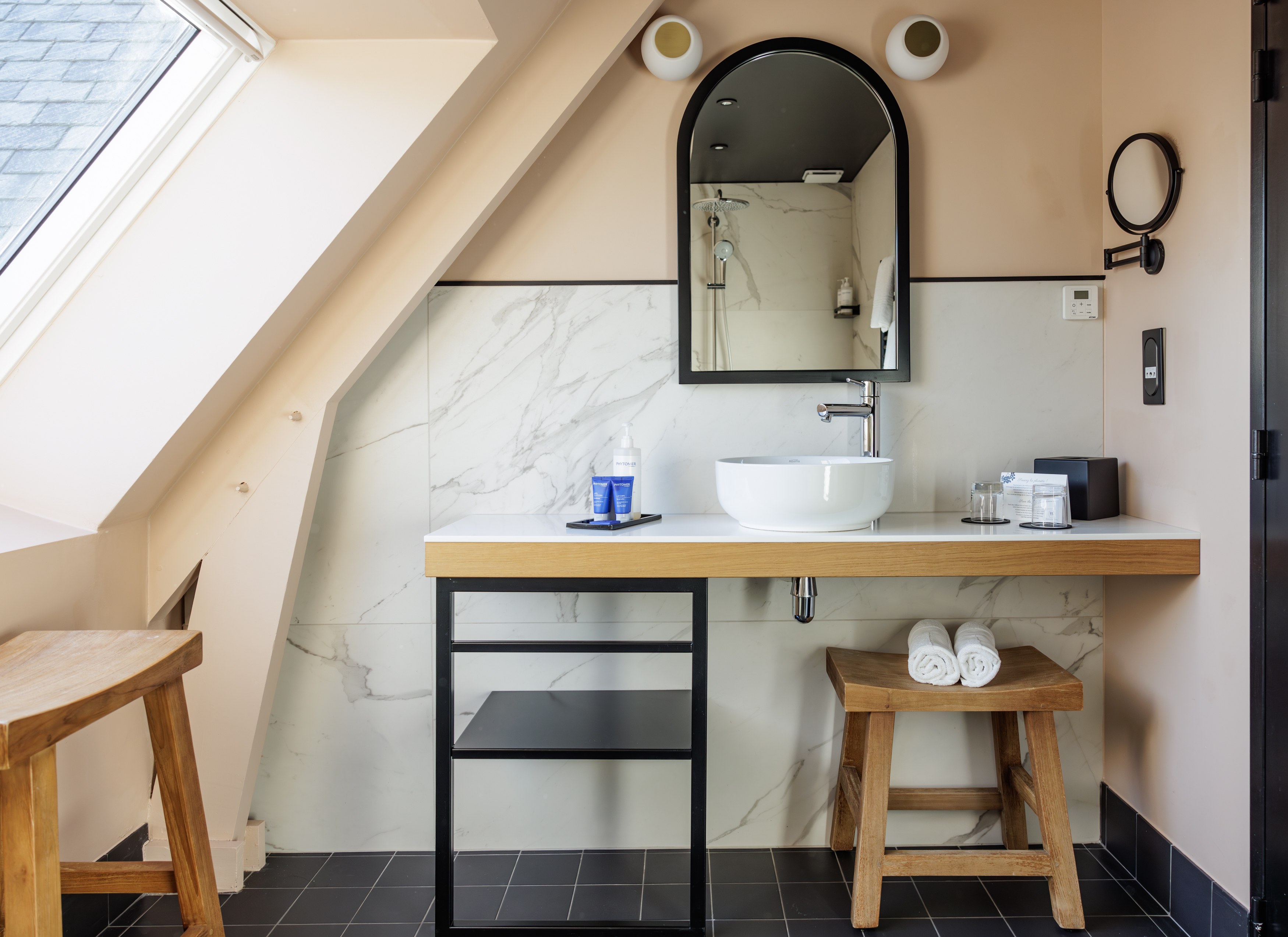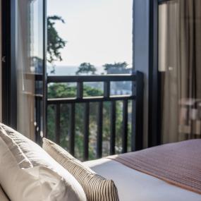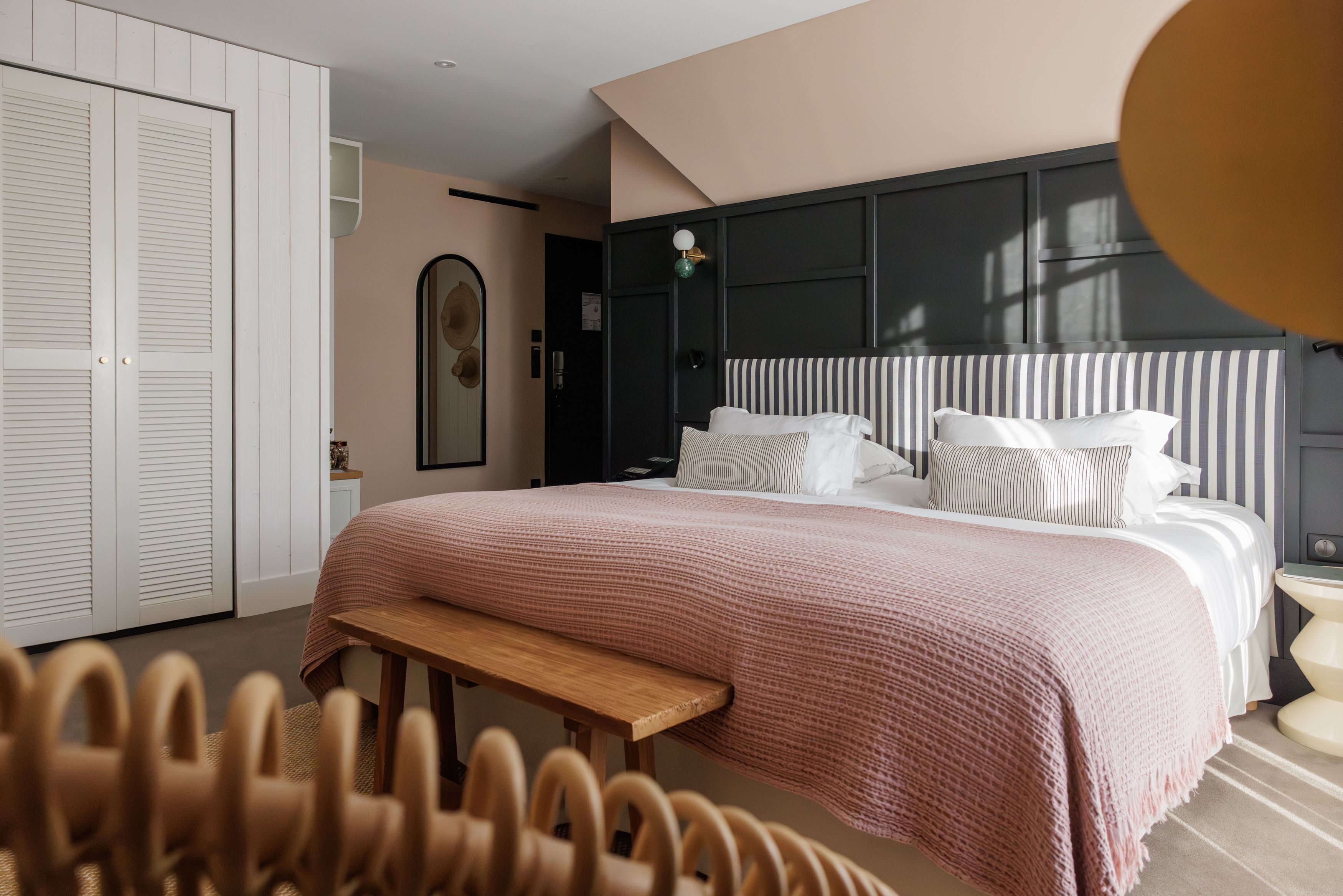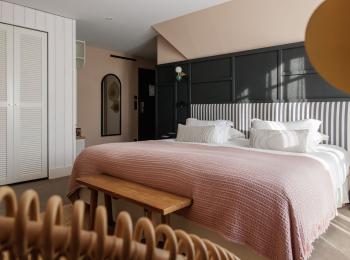 Dans une palette de roses poudrés, la Deluxe Signature (32 m²) compose un écrin contemporain aux accents Art déco. La lumière baigne l’espace, les textures dialoguent en finesse, et le regard file vers la Grande Plage de Carnac. Un refuge lumineux où l’on savoure l’instant, entre élégance subtile et confort absolu.